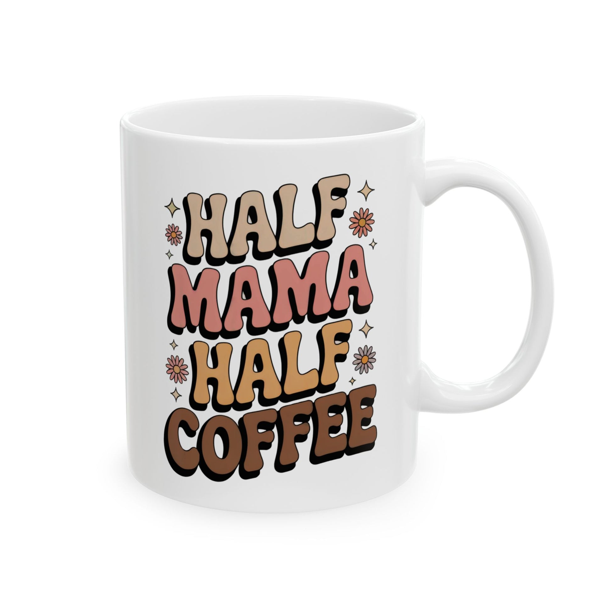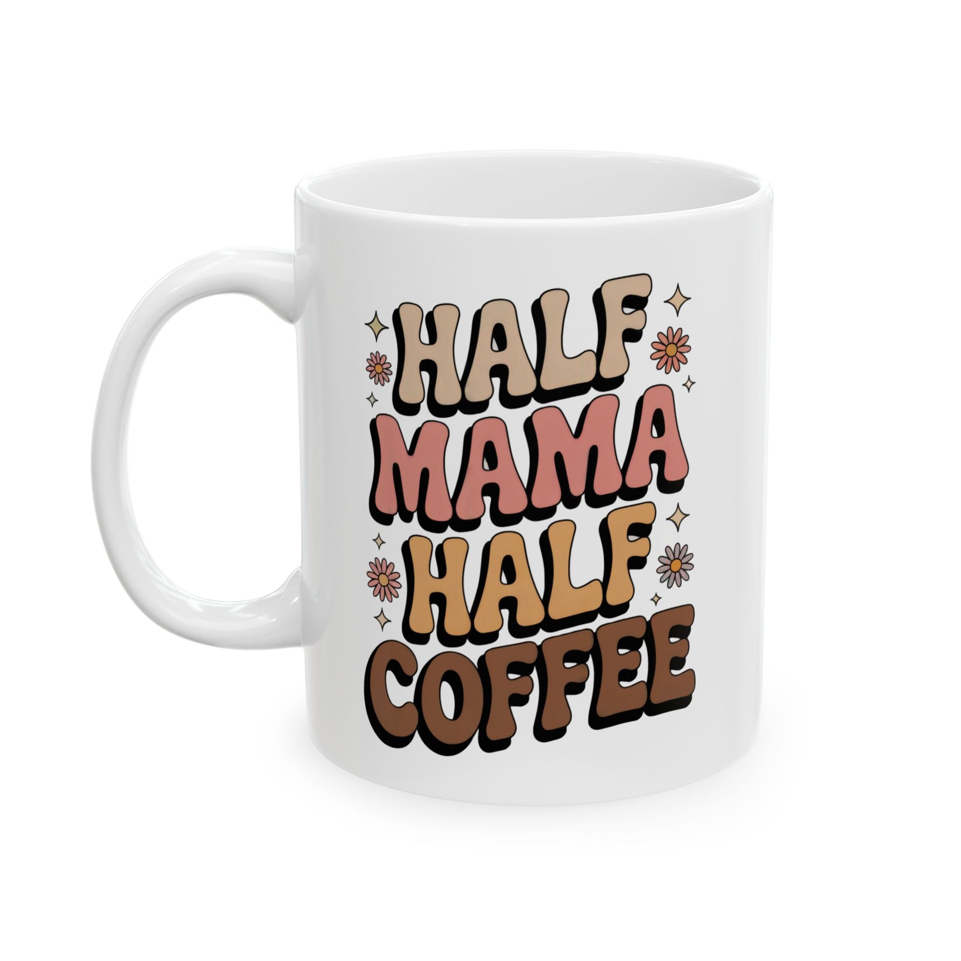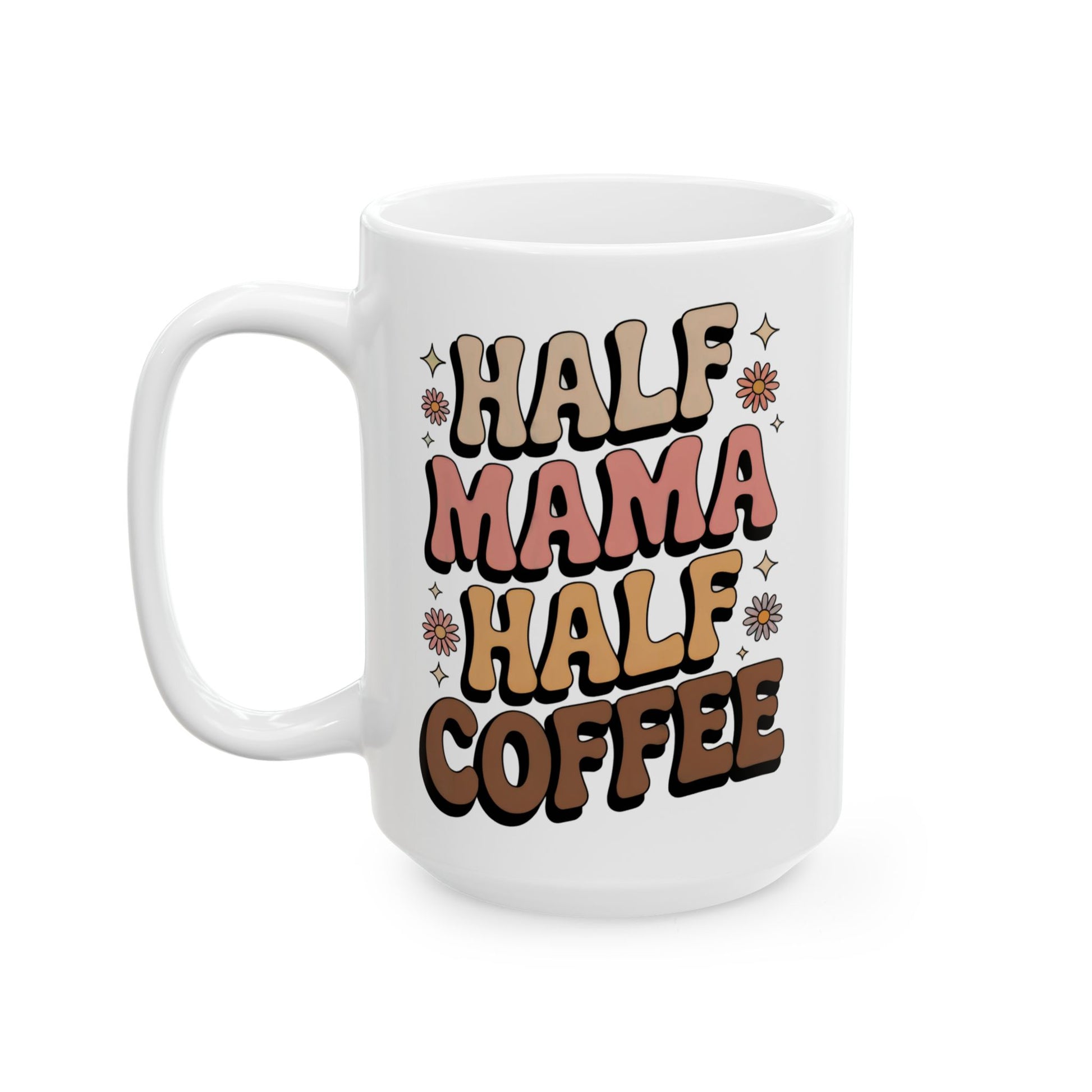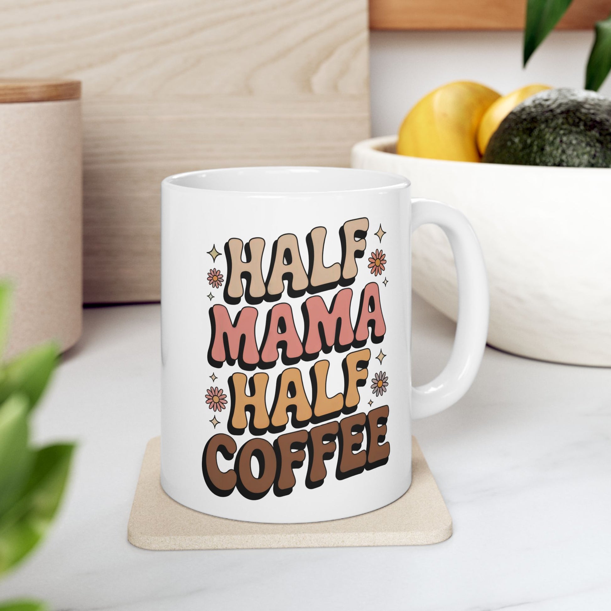 Fuel your day with retro charm and caffeine-powered mama strength with this vintage-inspired 'Half Mama Half Coffee' mug. Featuring bold typography in warm tones of beige, soft pink, and chocolate brown, accented with hand-drawn daisies and golden stars. Perfect for stylish moms who run on love and lattes, this mug channels mid-century ad vibes.