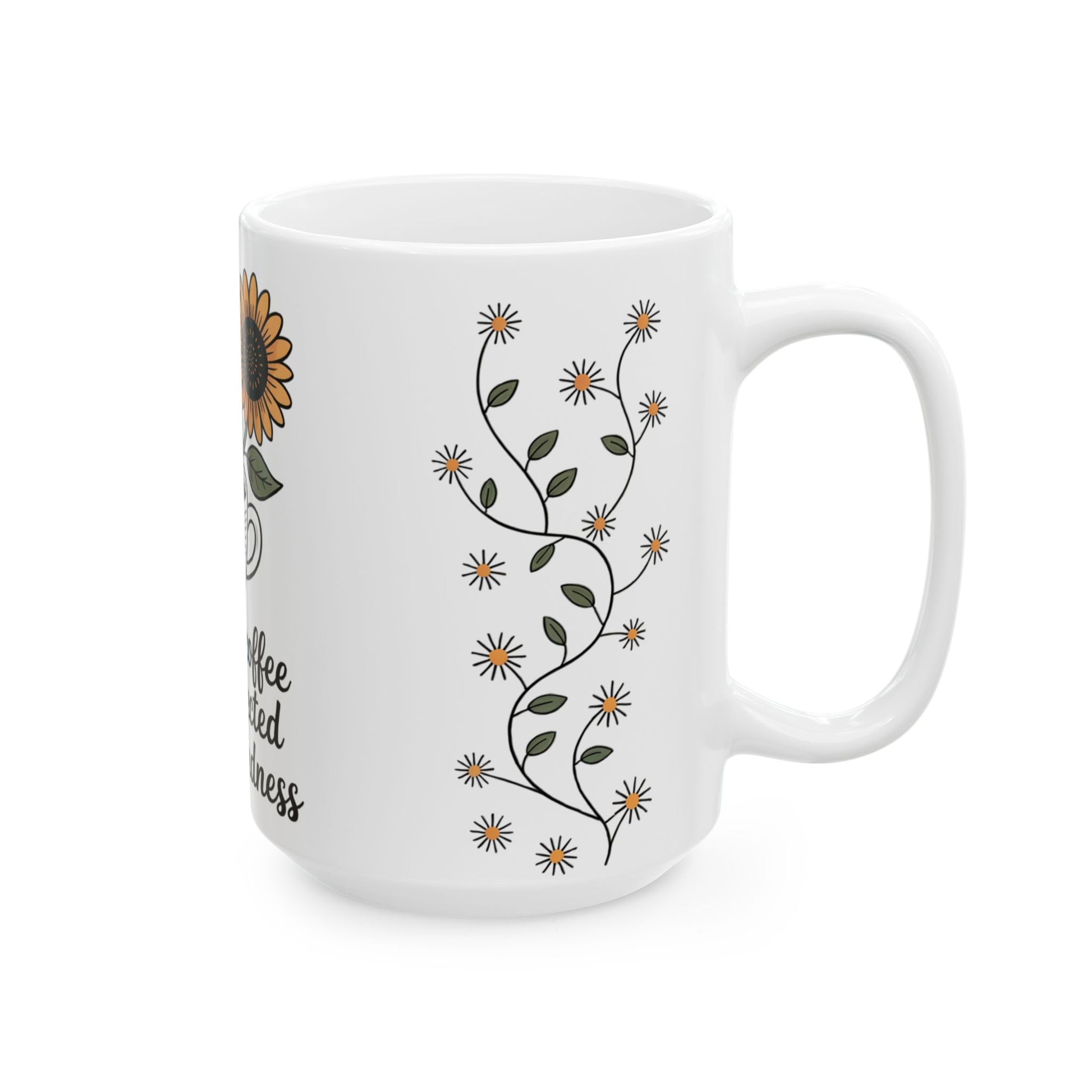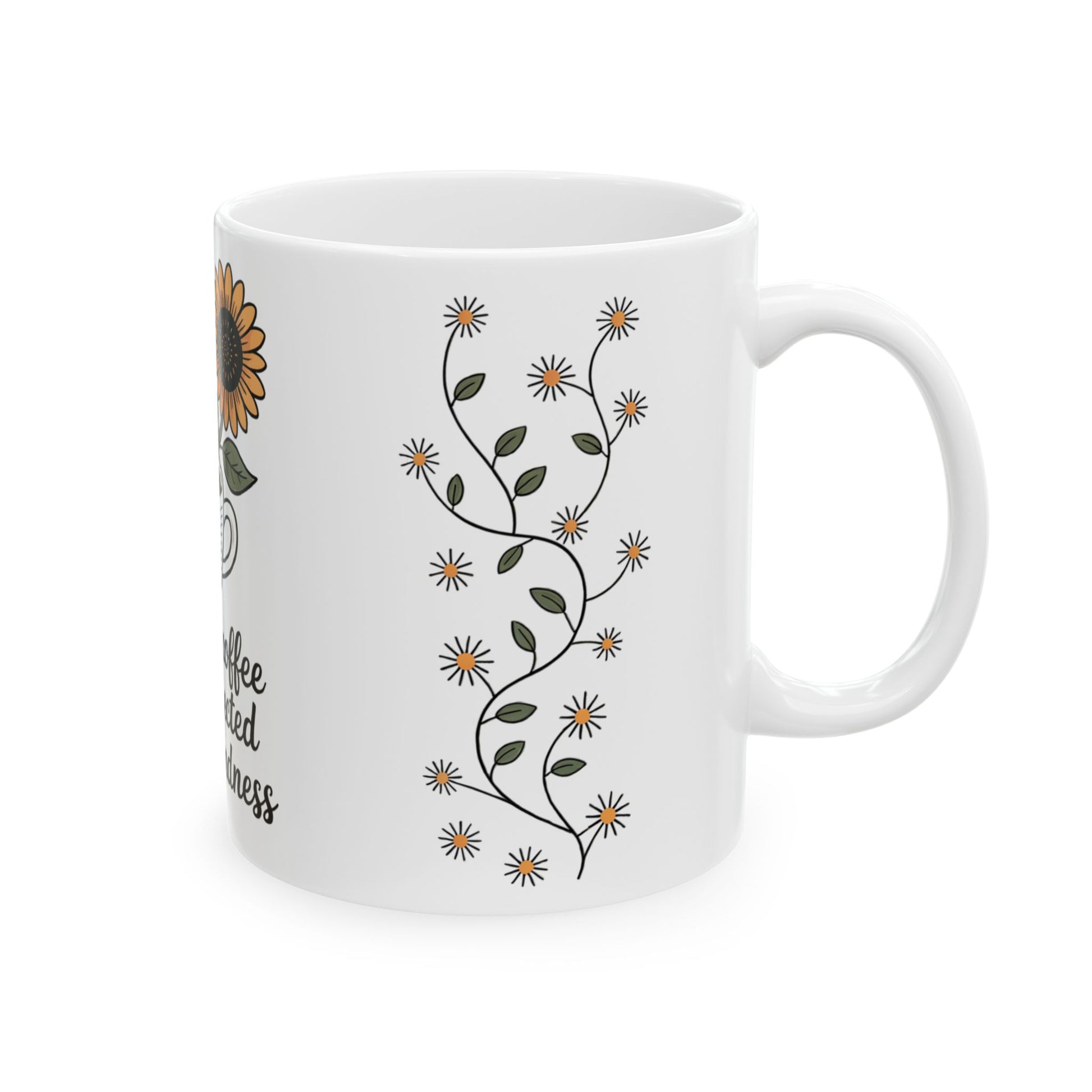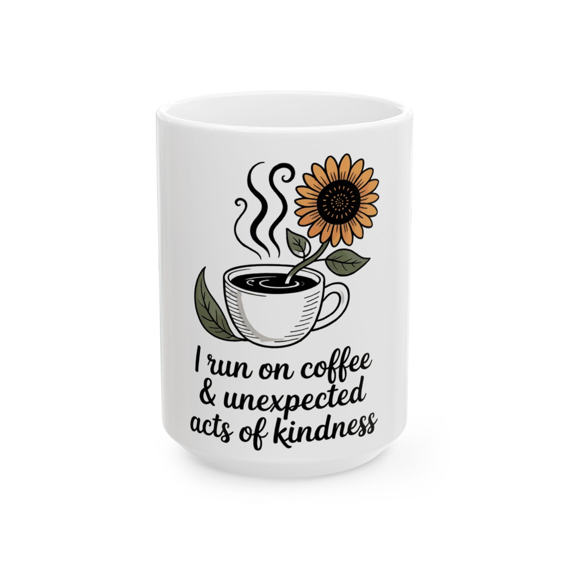 Fuel your day with purpose and positivity with this motivational ceramic mug featuring a charming black-and-white illustration of a coffee cup and sunflower. The delicate hand-drawn design includes vines and glowing stars symbolizing unexpected acts of kindness. This mug is a daily reminder that even small moments can bloom into something beautiful. Perfect for kindness lovers, coffee fans, teachers, moms, or anyone who inspires joy.