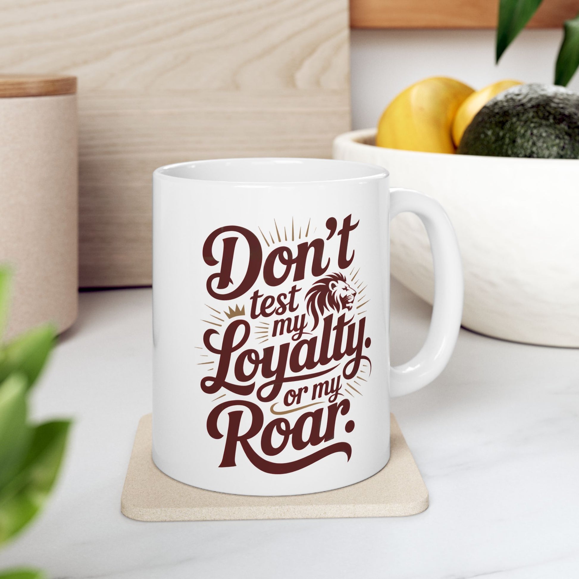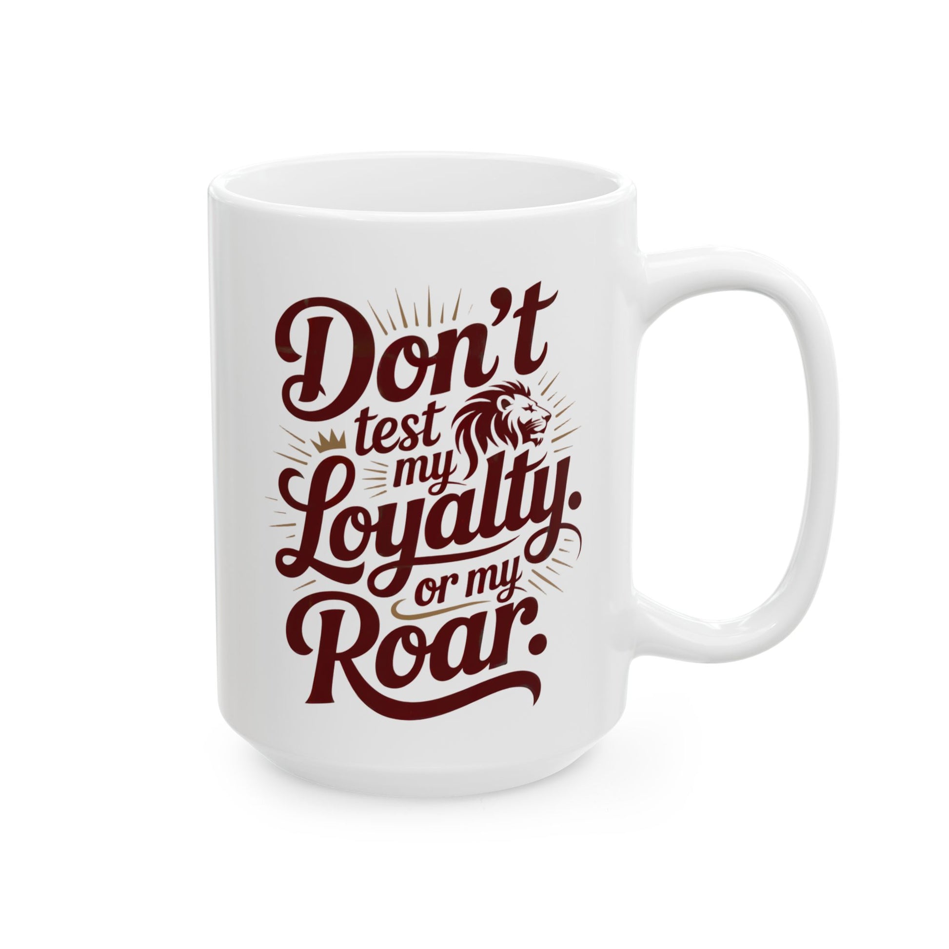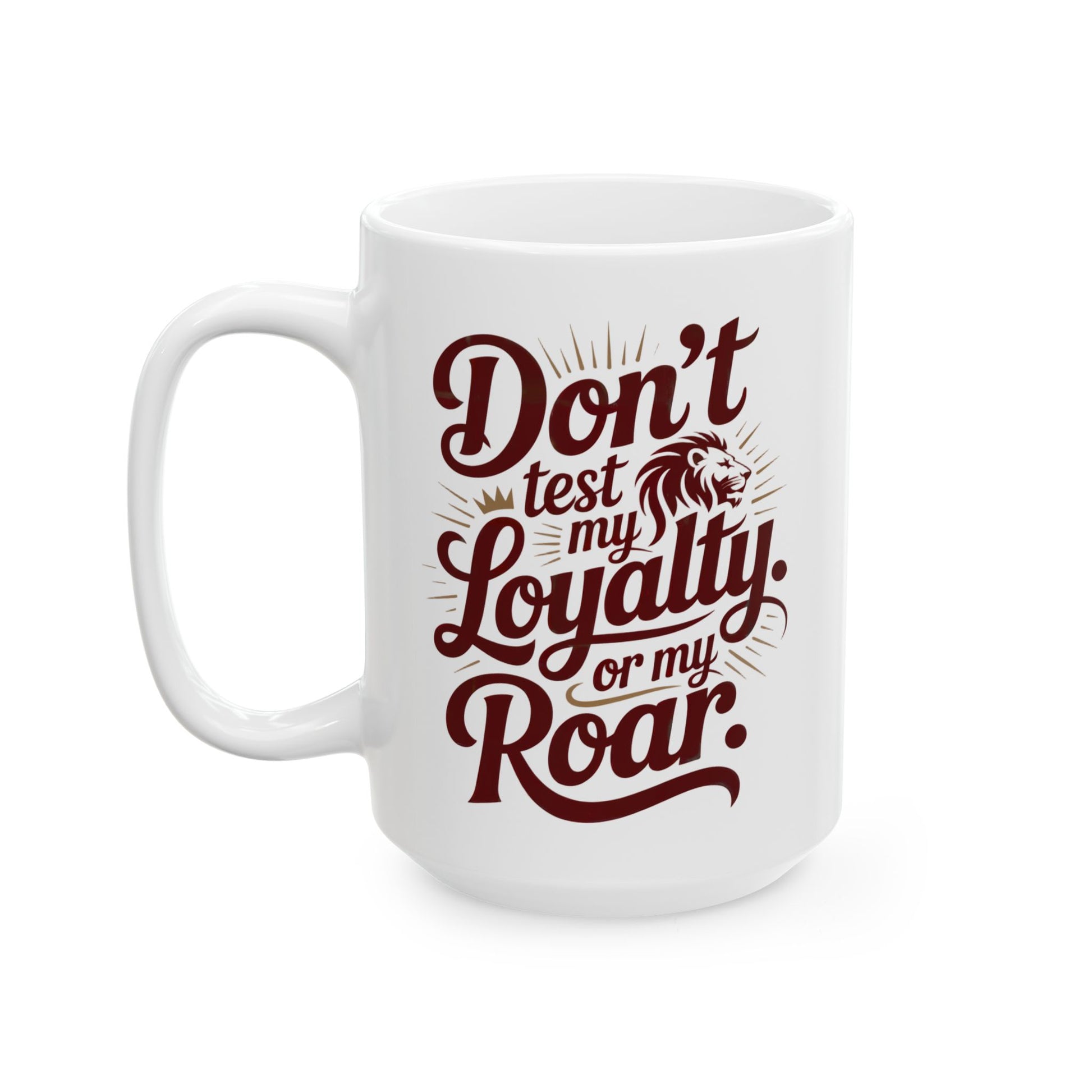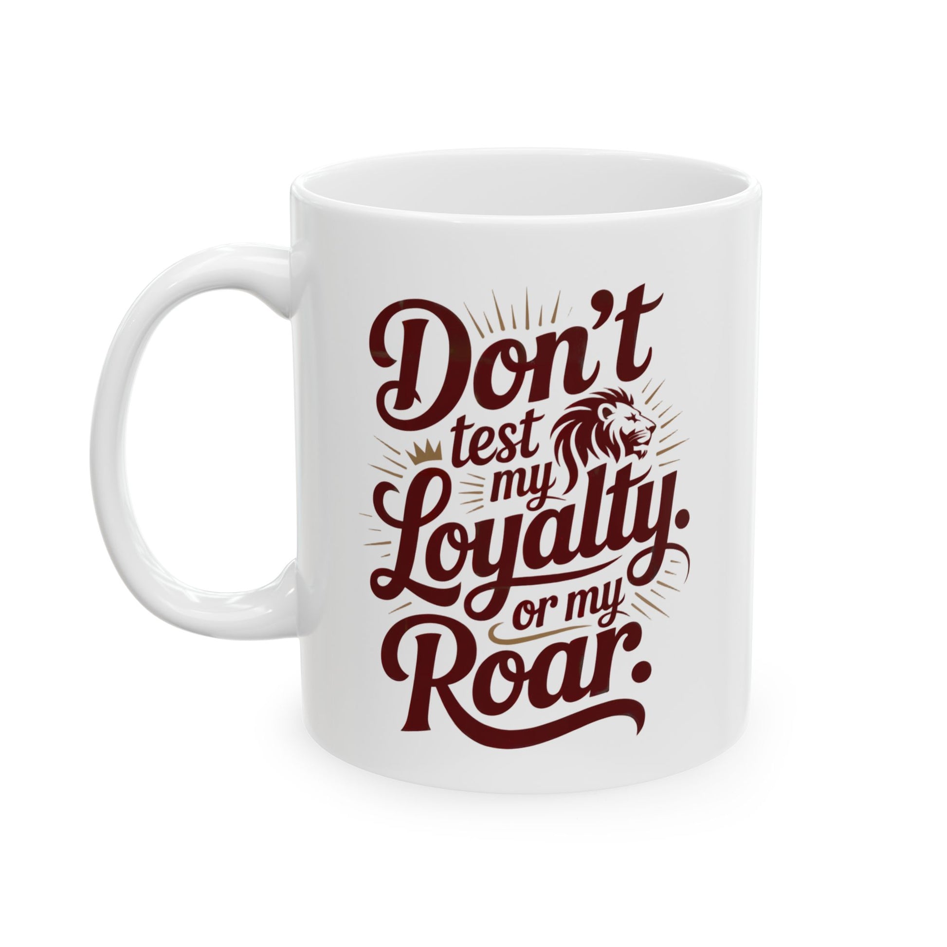 The “Don’t Test My Loyalty. Or My Roar.” mug brings heat and heart in every sip. Featuring gold-effect script, bold serif lettering, and a powerful lion emblem wrapped near the handle, it’s made for those who lead with love but don’t hold back their fire.