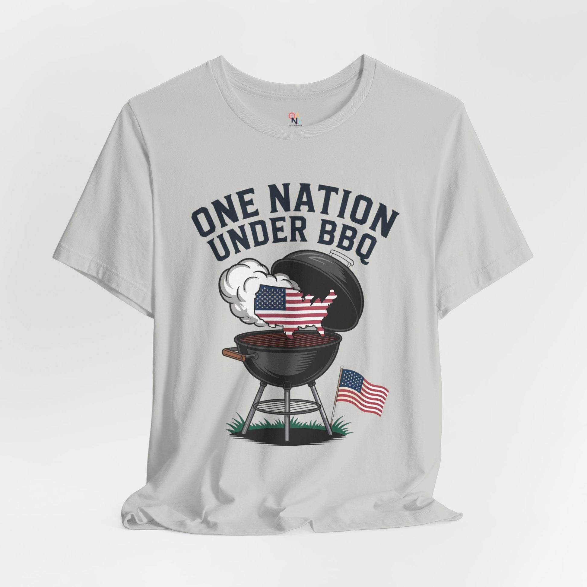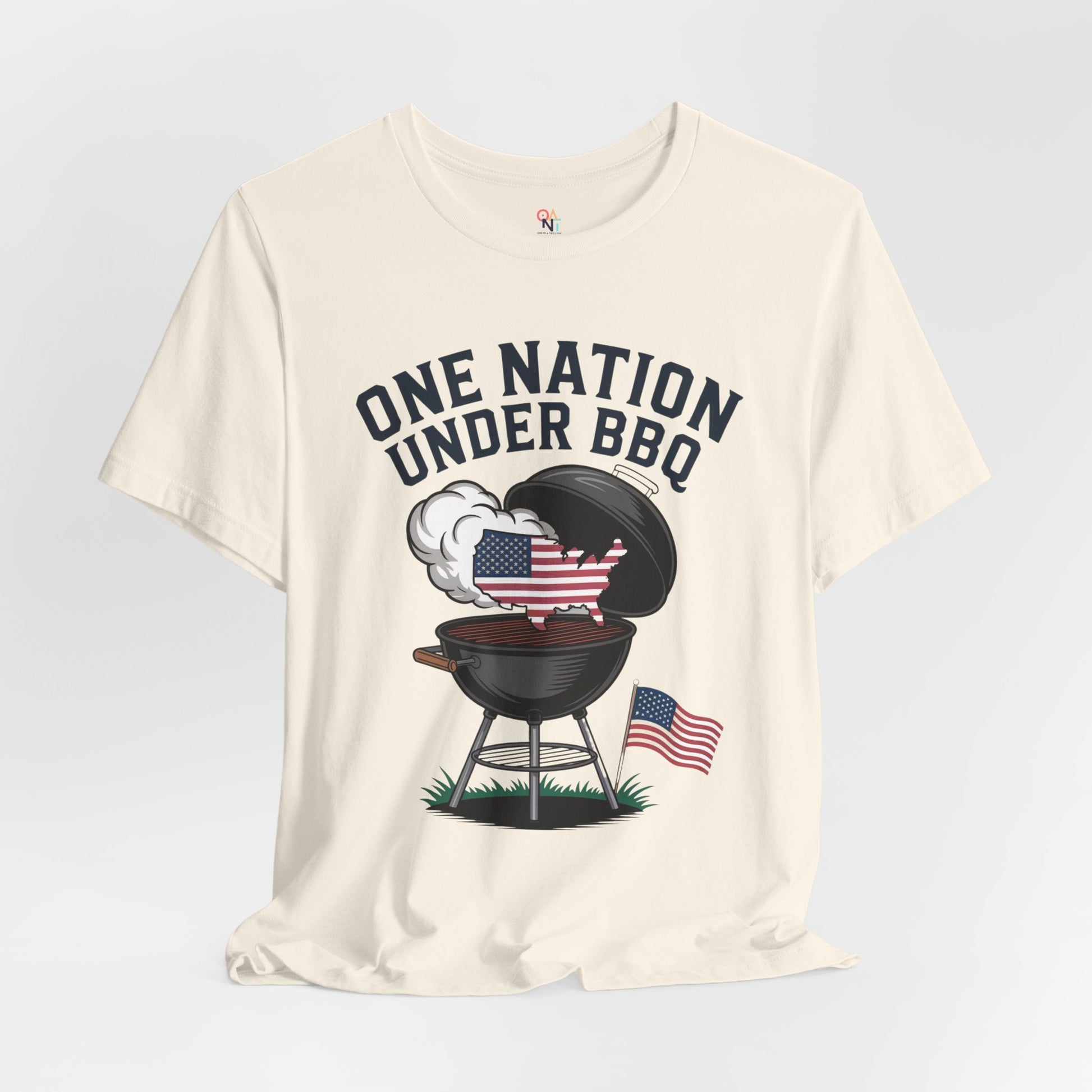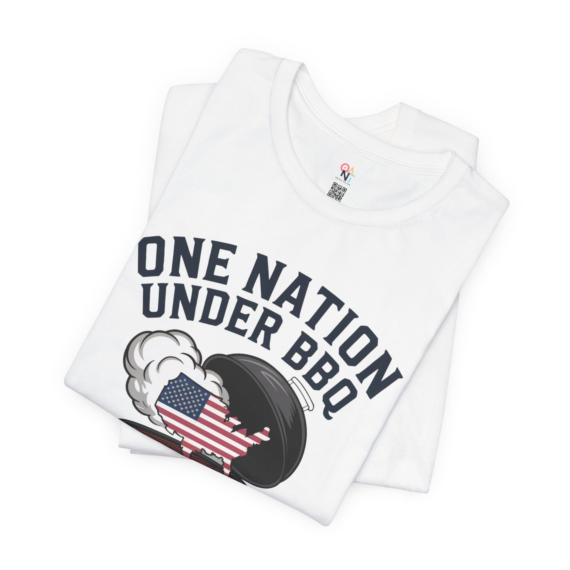 Feel patriotic and ready for summer with our 'One Nation Under BBQ' unisex t-shirt. Perfect for 4th of July, cookouts, and family reunions, this bold and funny tee is made for grill masters, BBQ lovers, and backyard heroes. Serve freedom with a side of flavor with this patriotic cookout shirt. Ideal for anyone looking to add a touch of patriotism to their summer wardrobe or celebrations.