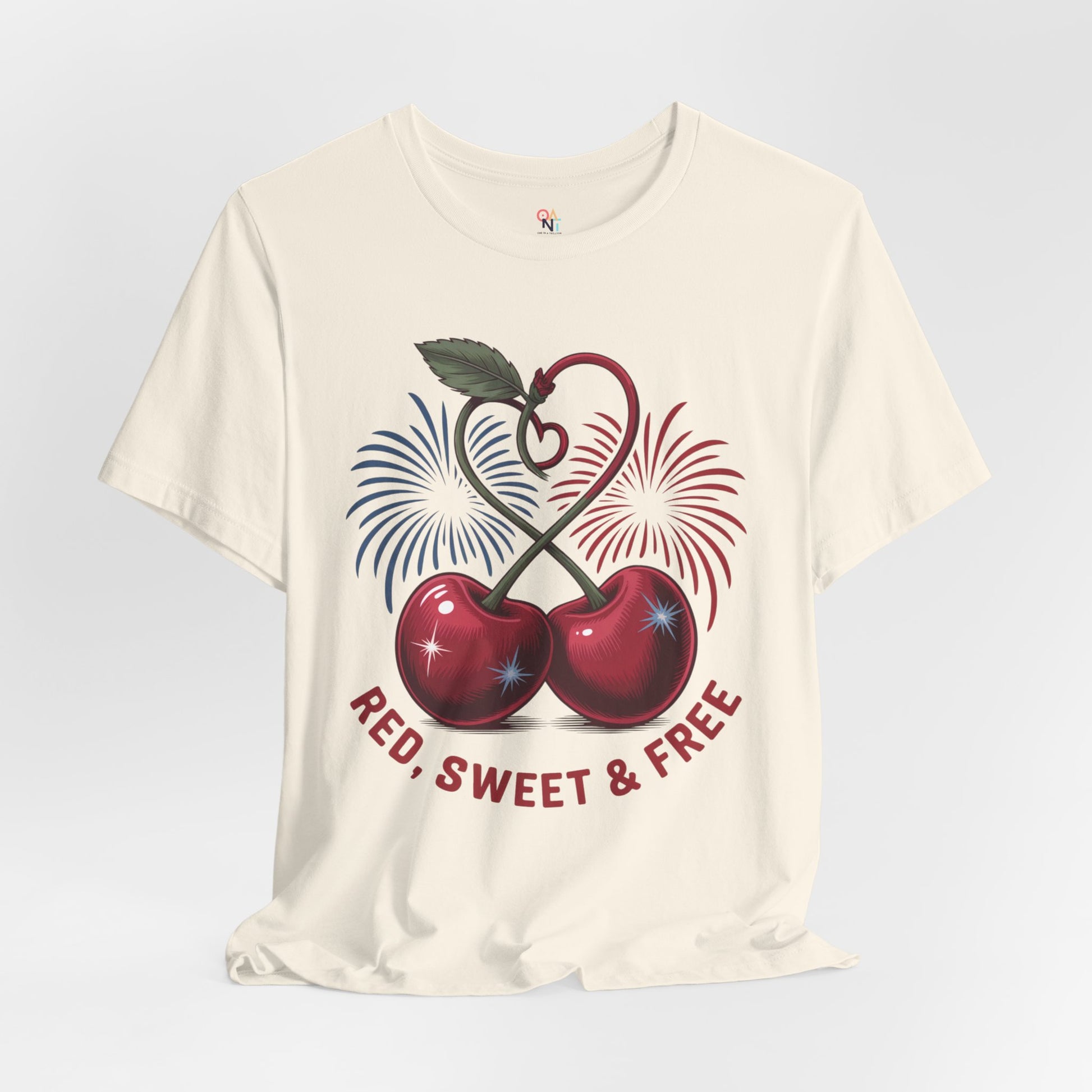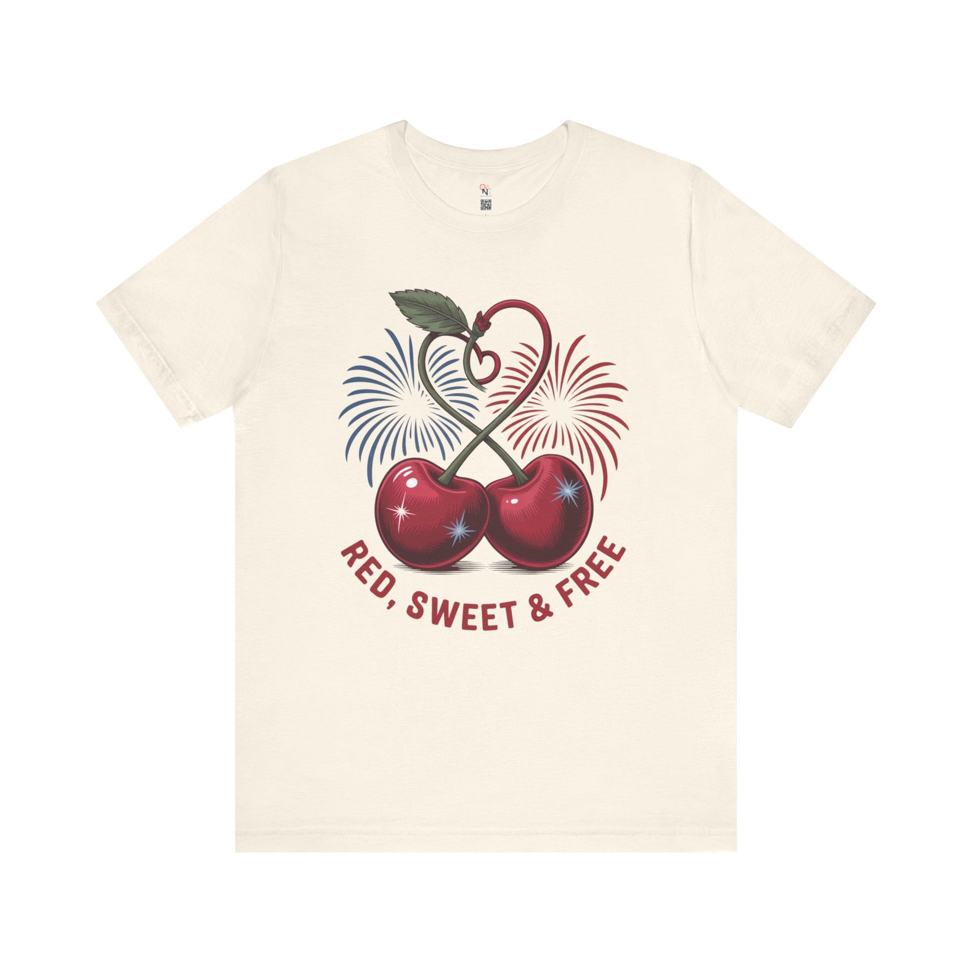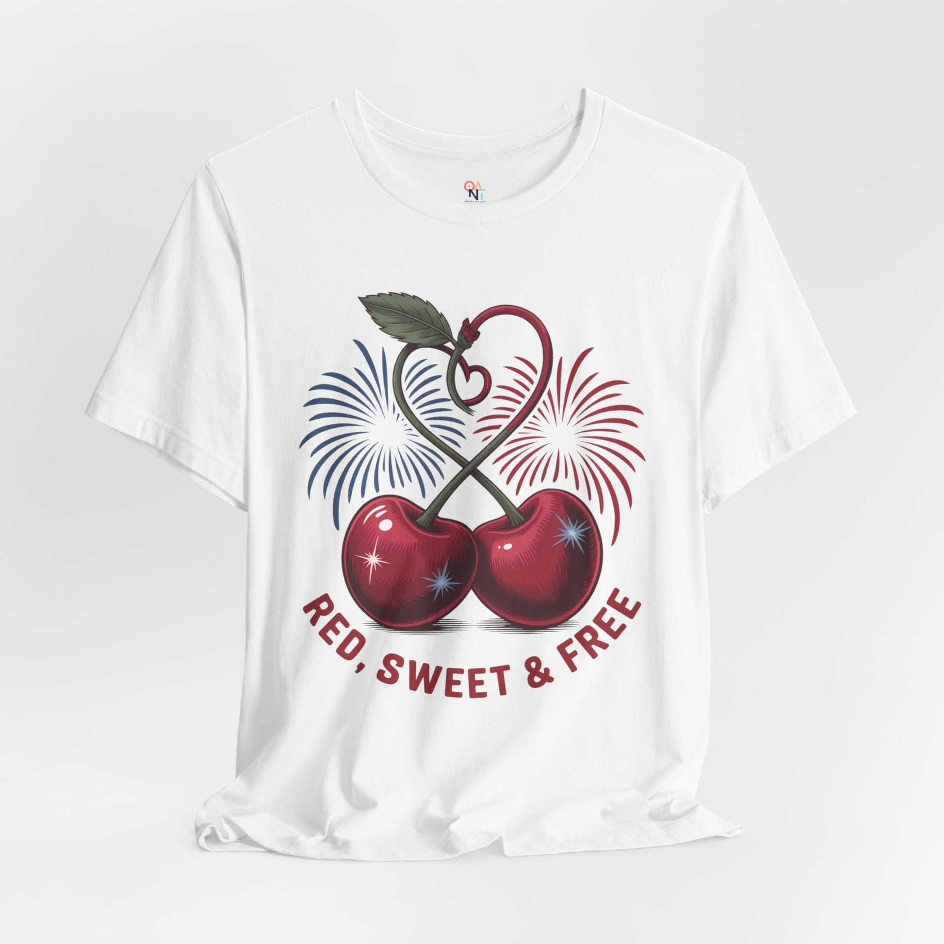 Celebrate freedom in style with our “Red, Sweet & Free” unisex t-shirt. Featuring glossy red cherries with heart-shaped stems, star tattoos, and festive fireworks, this bold and sweet design is perfect for your 4th of July vibe. Comfortable, eye-catching, and full of summer love. Ideal for those who love patriotic fashion and want to show off their American pride on Independence Day.
