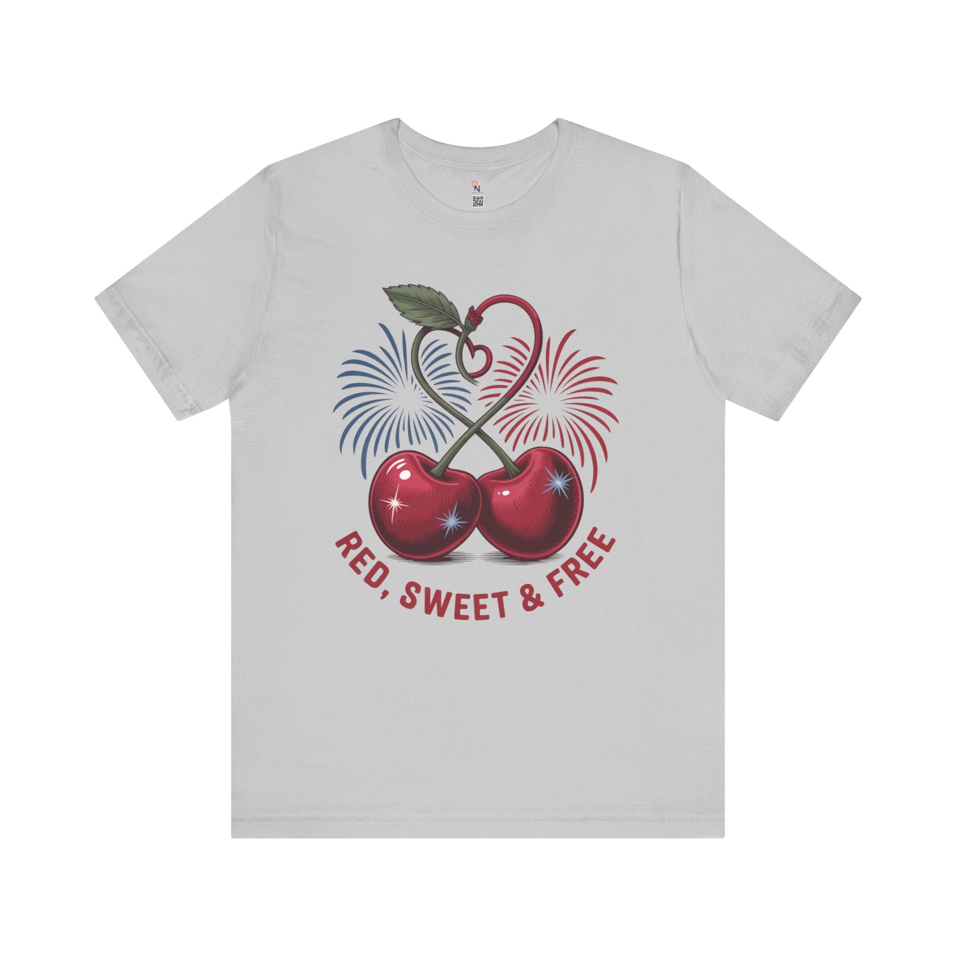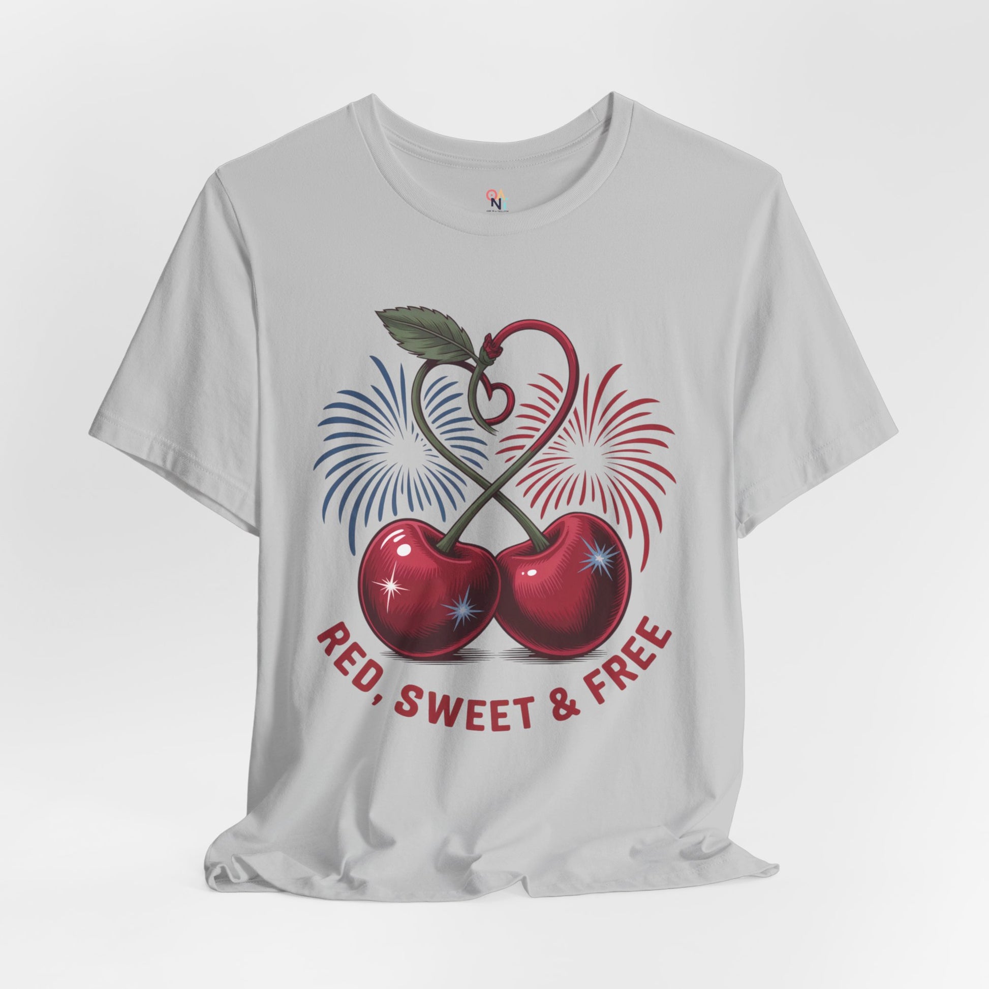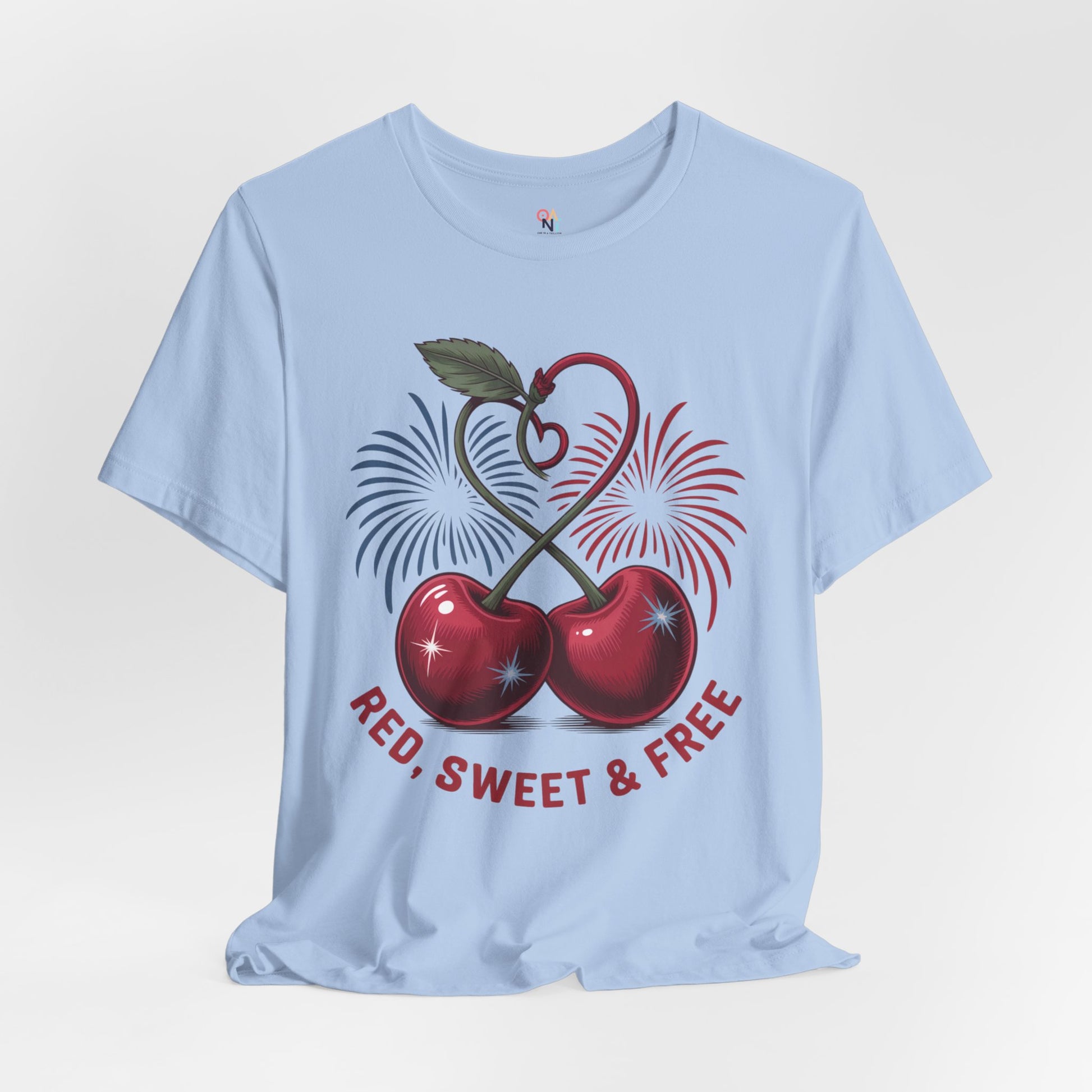 Celebrate freedom in style with our “Red, Sweet & Free” unisex t-shirt. Featuring glossy red cherries with heart-shaped stems, star tattoos, and festive fireworks, this bold and sweet design is perfect for your 4th of July vibe. Comfortable, eye-catching, and full of summer love. Ideal for those who love patriotic fashion and want to show off their American pride on Independence Day.